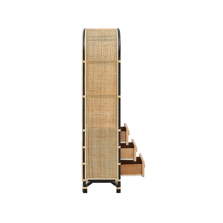 The 71" Janne Arched Natural Rattan Bookshelf blends wood and rattan in a sculptural design that balances style and storage. Featuring three open shelves for books or decorative items and six woven drawers for discreet organization, it offers versatile functionality. The gracefully curved frame and arched drawer pulls create a soft, elegant silhouette, while the sturdy X-cross base adds distinctive character and support. Equipped with non-marking foot caps and arriving fully assembled, this bookshelf brings refined practicality to living rooms, bathrooms, or any space seeking sophisticated storage. Natural rattan variations enhance each piece’s unique charm.