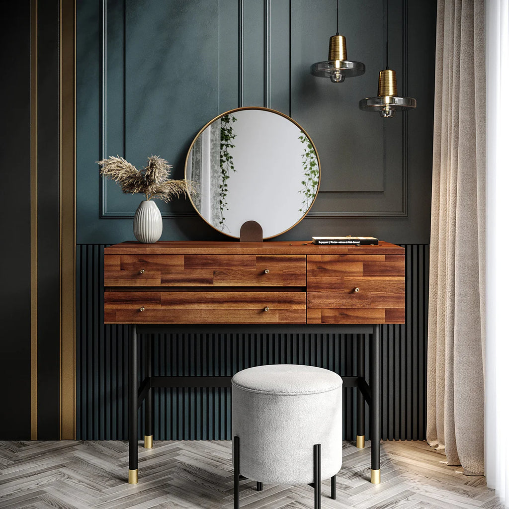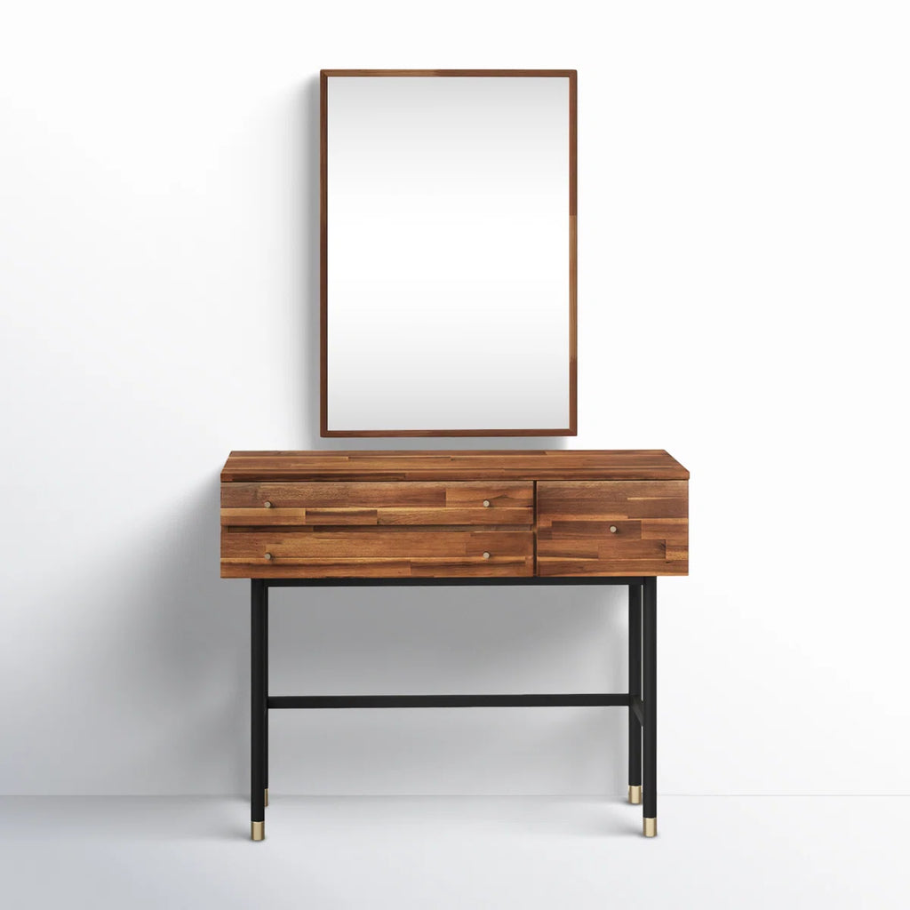 A no-nonsense vanity featuring a solid acacia wood body and black powder coated legs with gold tubes at their feet. There are three drawers - two on the left with the top drawer having compartments, and a third larger drawer on the right - for ample storage of knickknacks.